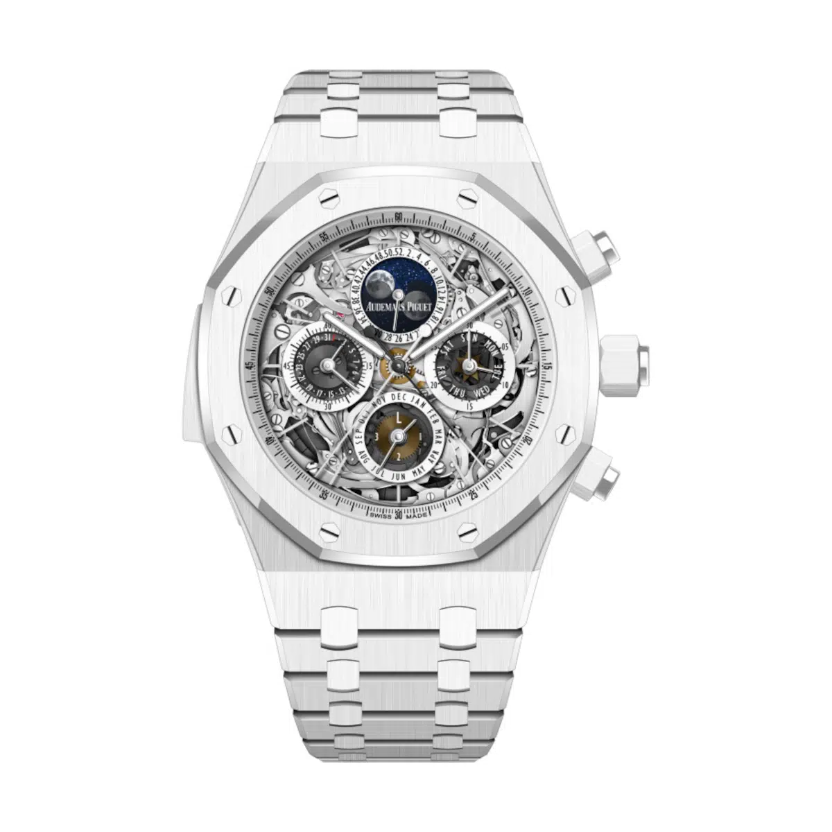 The watch’s most striking feature is its full case and integrated bracelet, meticulously crafted from high-tech white ceramic. This advanced material offers a strikingly contemporary aesthetic, distinguished by its pure, lustrous finish and exceptional scratch resistance. The iconic 41mm Royal Oak case, with its octagonal bezel secured by the famed eight hexagonal white gold screws, is reimagined in this modern medium. The contrasting brushed and polished finishes on the ceramic surfaces showcase Audemars Piguet’s relentless attention to detail, proving that even the most innovative materials can be finished with soul.