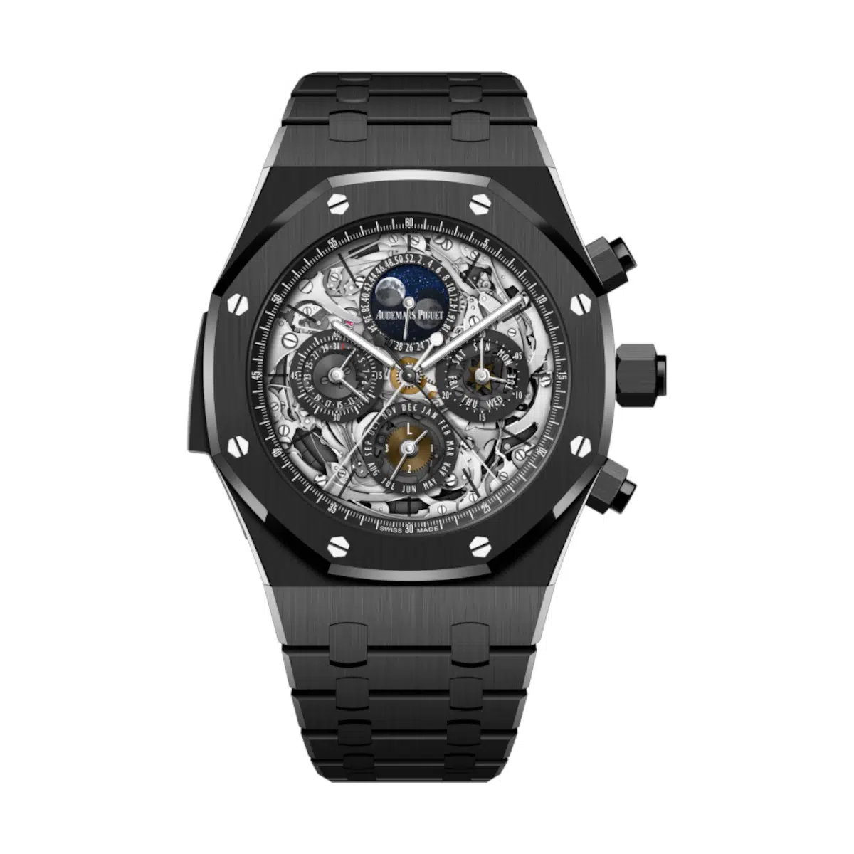 This Royal Oak shatters conventions with its monochromatic black ceramic construction. The entire case, bezel, and integrated bracelet are fashioned from this exceptionally hard, lightweight, and hypoallergenic material, prized for its subtle sheen and enduring resistance to scratches. The true marvel, however, lies in its facade. The watch features a revolutionary dial made entirely of sapphire crystal, meticulously skeletonized to frame the intricate mechanics of the Caliber 5134 movement. Every bridge, gear, and the elegant sweep of the automatic rotor is displayed with breathtaking clarity against a backdrop of dark tint, creating a mesmerizing, three-dimensional depth.