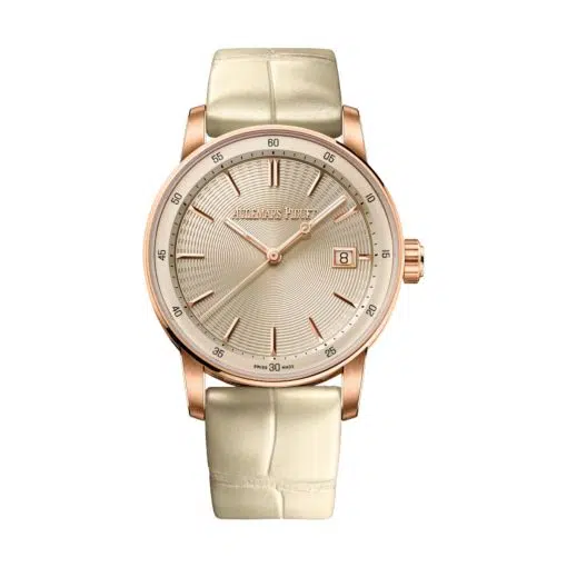 Ensuring a sublime fit on the wrist, the watch is paired with a hand-stitched beige alligator leather strap. Its supple texture and earthy tone complement the rose gold case and ivory dial with harmonious sophistication. The strap is secured by an 18k rose gold AP folding clasp, offering both security and a seamless aesthetic flow. This is a watch designed for daily appreciation, offering robust comfort alongside its striking appearance.