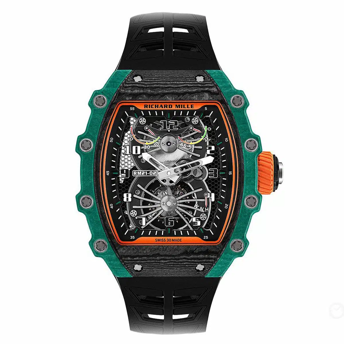 The soul of the RM 21-02 is its breathtaking, multi-tiered skeletonization. Richard Mille’s engineers have sculpted the movement and case into a cohesive, three-dimensional spectacle. The iconic tonneau-shaped case, crafted from cutting-edge materials like Carbon TPT® or Quartz TPT®, serves as a lightweight yet immensely strong exoskeleton. Every bridge and baseplate is meticulously openworked, transforming the caliber into a mesmerizing labyrinth of gears and jewels that invites endless exploration, while ensuring optimal rigidity and shock resistance.