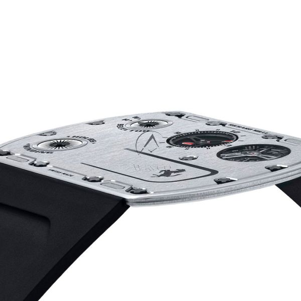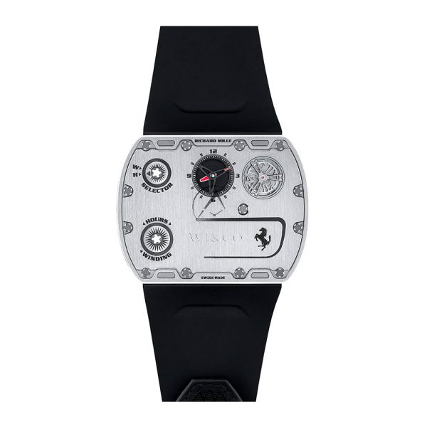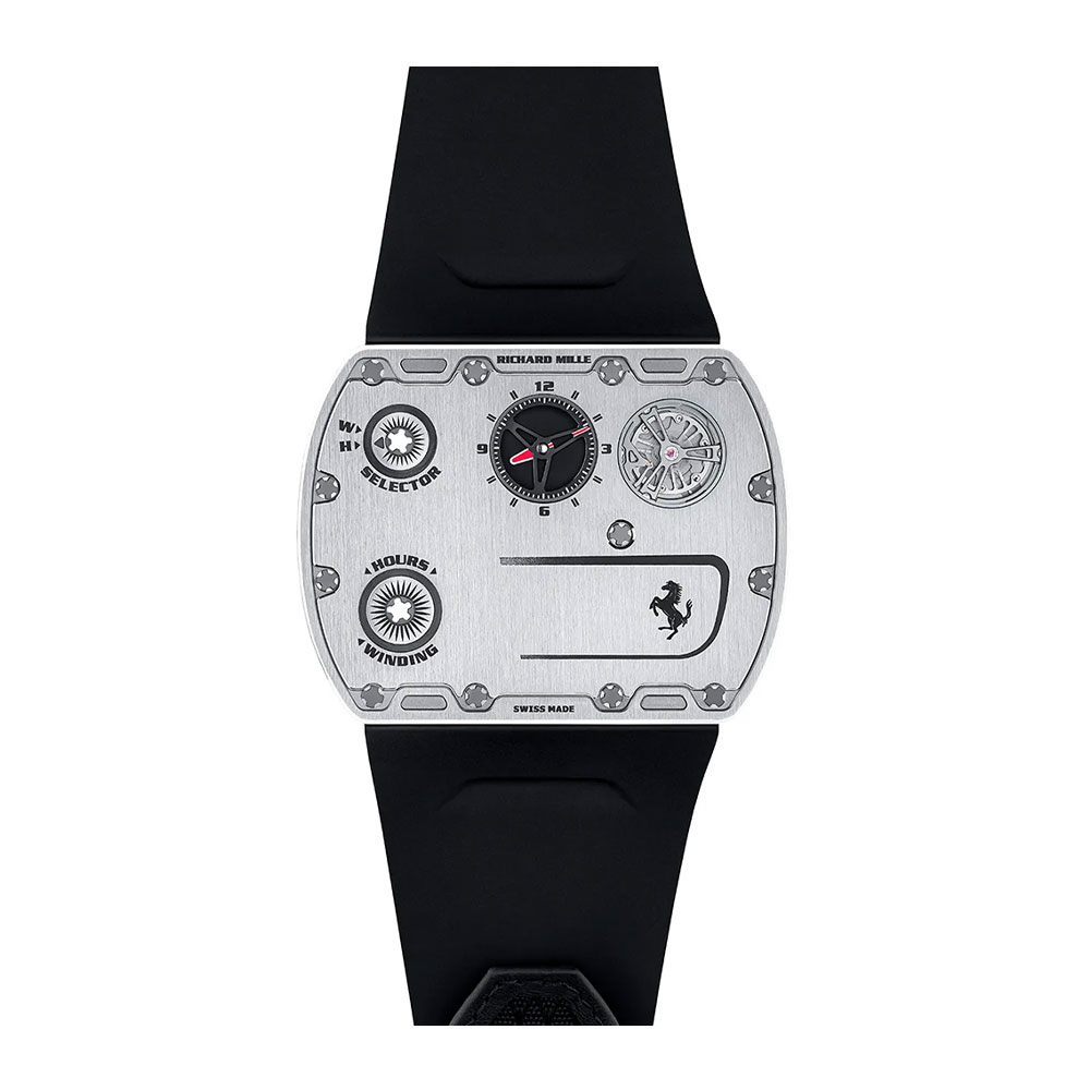 The RM UP-01’s design is a direct homage to Ferrari’s aerodynamic principles and pursuit of essentialism. Its tonneau-shaped case flows seamlessly into the integrated lugs, creating a robust yet incredibly light structure that sits effortlessly on the wrist. The dial is an exercise in purposeful clarity. Time is displayed via large, central hands against a openworked background, with a subtle Ferrari cavallino prancing horse emblem at 12 o’clock and Richard Mille’s signature at 6 o’clock. The function selector—akin to a gear shift—at 9 o’clock allows easy switching between winding, time-setting, and neutral modes, a signature R.M. feature that enhances usability and protects the movement.