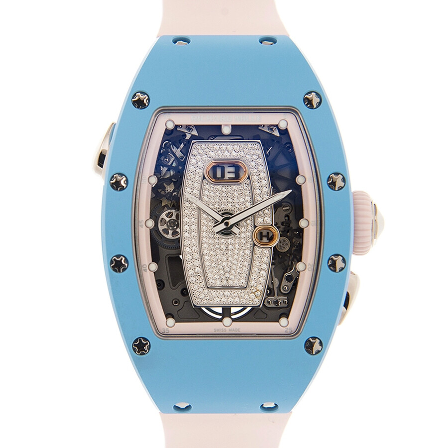 At the heart of the RM037’s appeal is its revolutionary construction. The case, frequently rendered in gleaming white ceramic, offers exceptional scratch-resistance and a strikingly modern finish. This high-tech ceramic is notoriously difficult to machine, a challenge that Richard Mille’s technicians overcome to achieve its flawless curves and perfect polish. Complementing this are accents of 18k white or red gold, and on certain models, a breathtaking pavé of brilliant-cut diamonds adorning the bezel, transforming the watch into a beacon of light on the wrist. The skeletonized dial reveals the intricate heart of the watch—the sophisticated automatic movement. Every bridge, gear, and rotor is finished by hand, showcasing a level of artistry typically reserved for the finest Swiss complications.