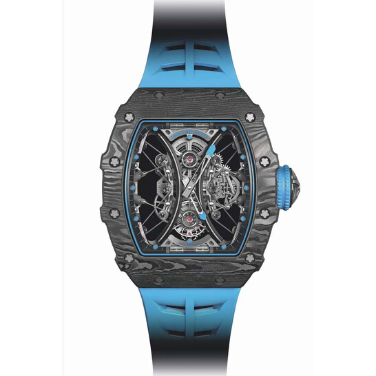 Every detail echoes its sporting pedigree. The case, crafted from ultra-light, ultra-strong Carbon TPT®, features a unique, asymmetrical bezel that protects the crown during play. The strap, made from the same resilient rubber used for Formula 1 tires, ensures comfort and grip. Yet, this robustness is balanced with luxury—the pushers are crafted from polished white gold, and the case screws are in 5N red gold, highlighting Richard Mille’s uncompromising attention to finish.